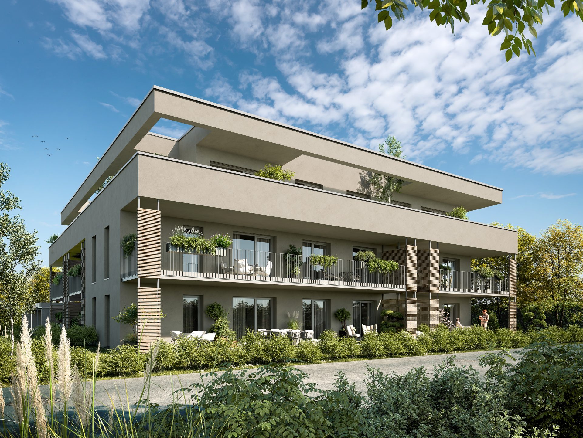 Vier großzügige Gartenwohnungen eröffnen mit Eigengärten von bis zu 171 m² private Freiräume, die zum Entspannen und Genießen einladen. Vier stilvolle Einheiten im ersten Obergeschoss überzeugen durch lichtdurchflutete Räume und weitläufige Balkone. Den krönenden Abschluss bilden drei exklusive Penthouse-Wohnungen, deren großzügige Dachterrassen einen unvergleichlichen Blick und ein Höchstmaß an Privatsphäre bieten.