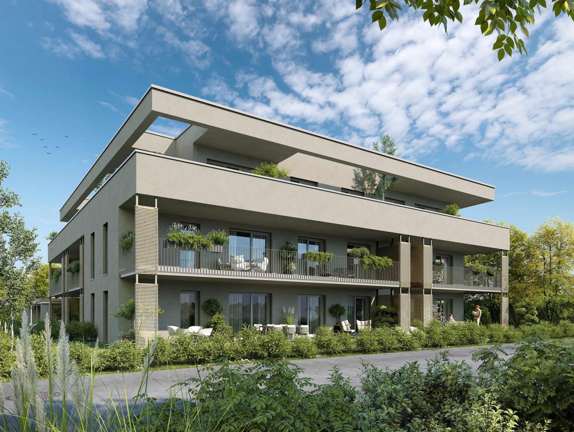 Vier großzügige Gartenwohnungen eröffnen mit Eigengärten von bis zu 171 m² private Freiräume, die zum Entspannen und Genießen einladen. Vier stilvolle Einheiten im ersten Obergeschoss überzeugen durch lichtdurchflutete Räume und weitläufige Balkone. Den krönenden Abschluss bilden drei exklusive Penthouse-Wohnungen, deren großzügige Dachterrassen einen unvergleichlichen Blick und ein Höchstmaß an Privatsphäre bieten.