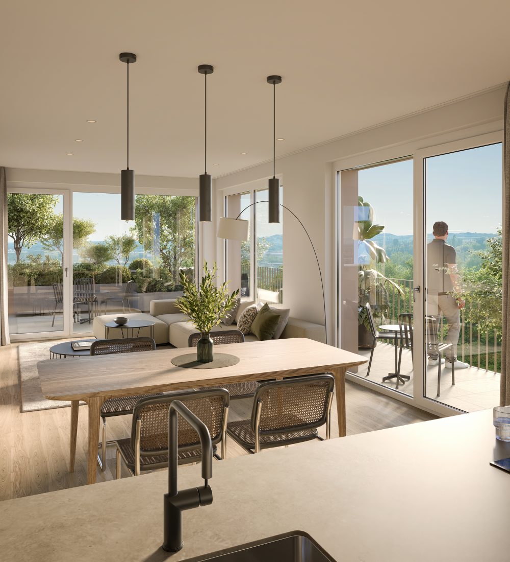 Die Wohnflächen von ca. 42 bis 88 m² sind optimal genutzt und folgen einer modernen, klaren Raumaufteilung. Große Glasfronten schaffen ein helles, freundliches Wohnambiente und verbinden Innen- und Außenraum auf elegante Weise. Die vorwiegende Süd- und Westausrichtung sorgt dabei für eine ideale Belichtung und ein angenehmes Wohngefühl zu jeder Tageszeit.